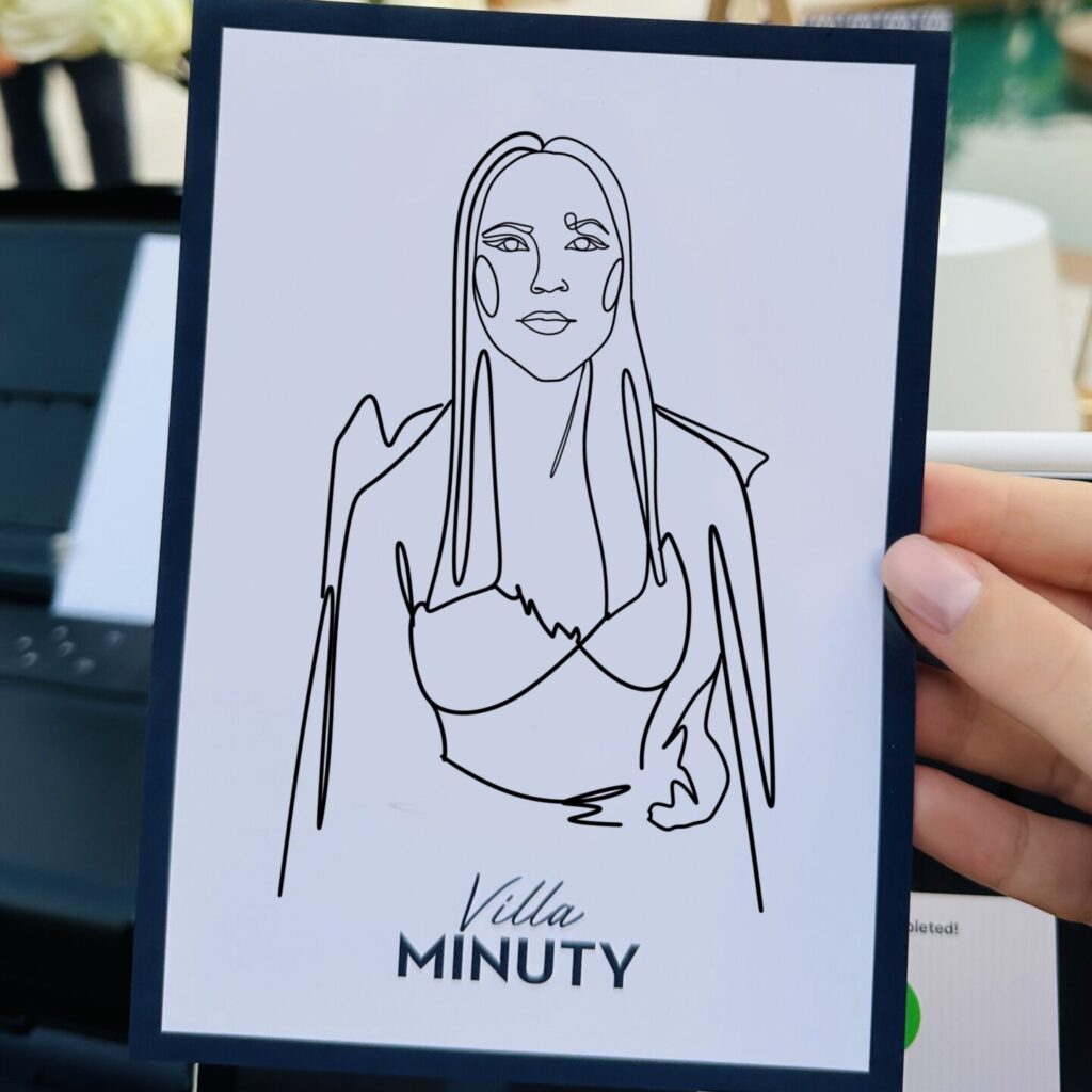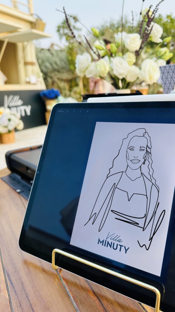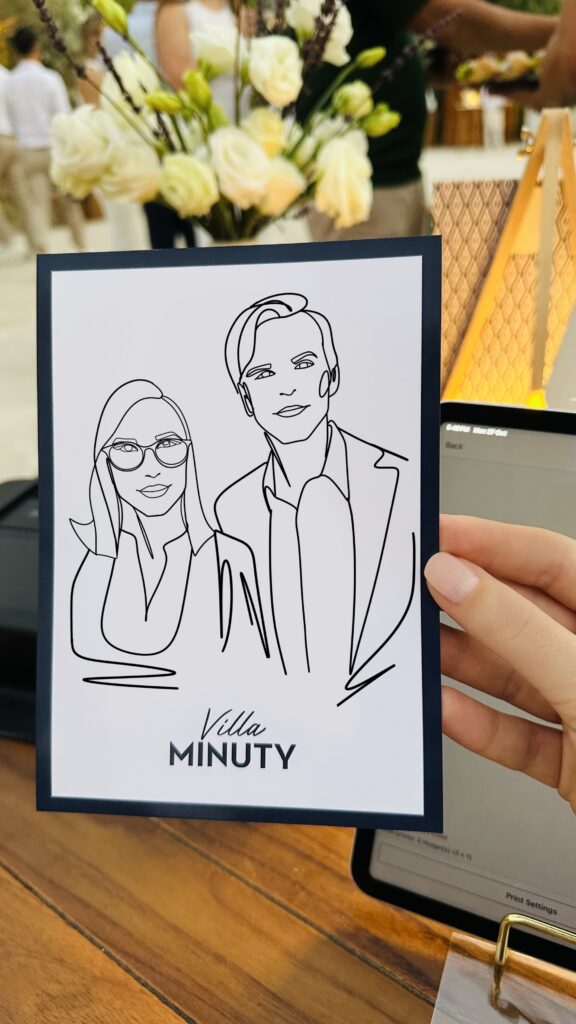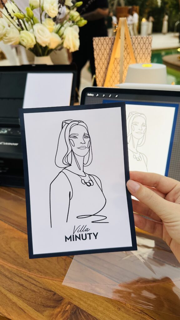 I offer on-the-spot digital portraits (A6 or A5) as well as live watercolor sketches, capturing the essence and style of each guest.